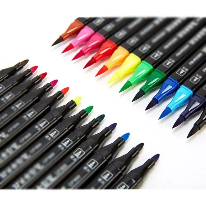 - Doble Punta - Fina 1mm y tipo BRUSH 1 a 3mm - Brillantes y coloridos, resistentes al agua - Ideales para la ilustración, anime, manga, diseños, dibujo, arquitectura - De uso profesional y también para principiantes - El set incluye 18 marcadores + Estuche tipo valija con manija. - Marcador a base de alcohol. - Adsorción uniforme de la tinta, salida suave.