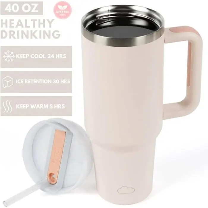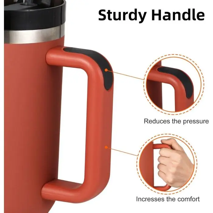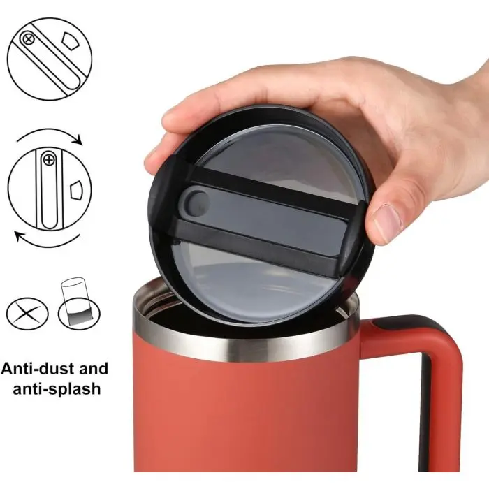 Capacidad: 1200ml Peso: 533grs Alto: 25cm Diámetro base: 7,3cm Diámetro boca: 9,8cm Recubrimiento POWDER COATED Doble pared aislante. Superficie antideslizante. Tapa hermética a rosca. Con sorbete rebatible. Con Manija de sistema desmontable. Apto bebidas frías o calientes.